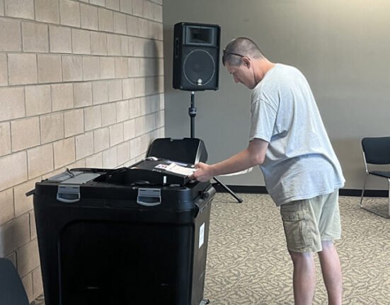 News Photo by Steve Schulwitz Justin Sytek deposits his ballot into a tabulator after voting at the APlex on Tuesday.