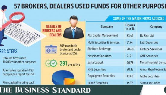 The firms include Akij Capital Management, Multi Securities and Services, Sheltech Brokerage, Moshihor Securities, Salta Capital, and KHB Securities. Each of these firms