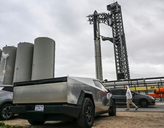 A man looks at a Tesla Cybertruck parked near the SpaceX Starship as it stands on the launch pad … [+] ahead of