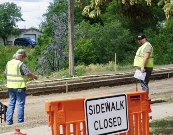 Jill Schramm/MDN Workers with a city contractor were working on the lights at the Burdick Expressway and Broadway intersection Monday. The City of