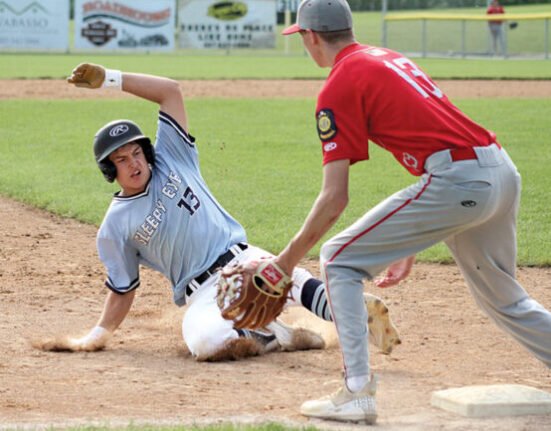 Staff photo by Travis Rosenau Sleepy Eye Post 7’s Jonny Petermann slides into third for a triple during a the Sub-Sub State B