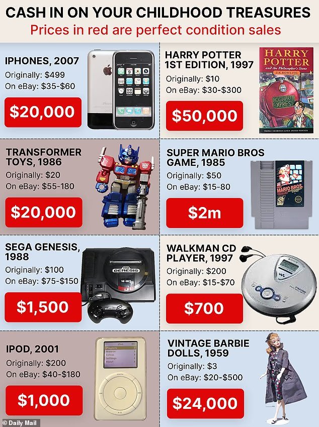 It’s not just auction-block rarities either. On eBay, the Daily Mail found Barbie dolls are listed anywhere from $20 to $500, comic books fetching between $50 and $1,000, and Lego sets ranging from $30 to $200.