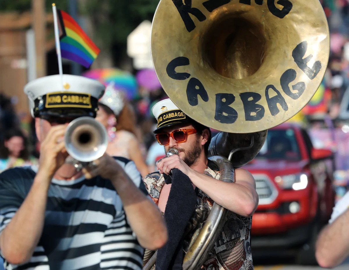 The King Cabbage Brass Band from Tulsa plays on June 4, 2023, during the Gay Pride Parade in Oklahoma City.
