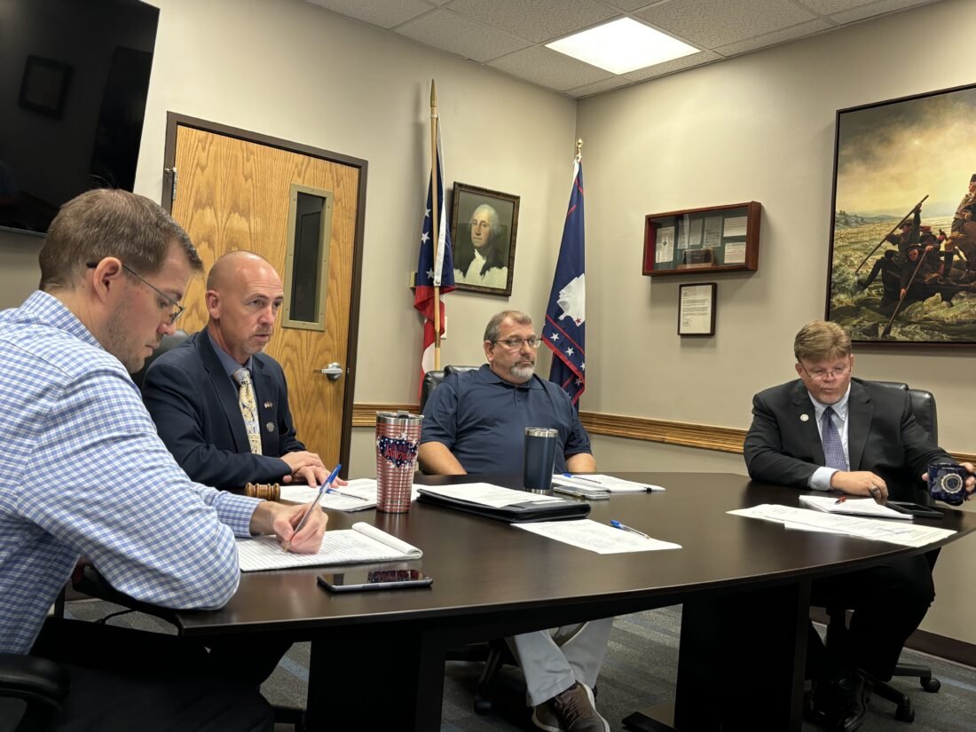 Washington County Commissioner James Booth, second from left, expressed disagreement with creating a community development fund with $1.5 million into the fund for the Southeastern Ohio Port Authority to use to purchase the former AMP Gorsuch site. (Photo by Michelle Dillon)