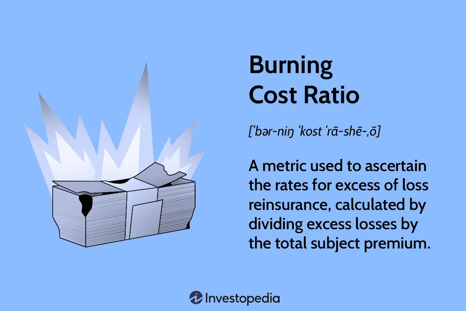 In the insurance sector, the term “burning-cost ratio” refers to a metric that can be calculated by dividing excess losses by the total subject premium. This figure is chiefly used to ascertain the rates for excess of loss reinsurance, which is the insurance that insurance companies themselves procure, to ensure that they remain solvent, should they fail to collect the adequate premiums needed to cover total claims.