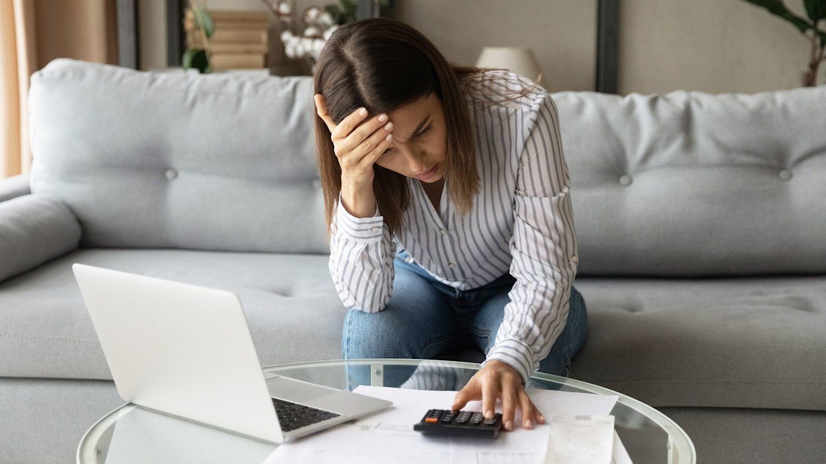 Worried mature woman using calculator and laptop for managing domestic finances and invoices© Getty Images
