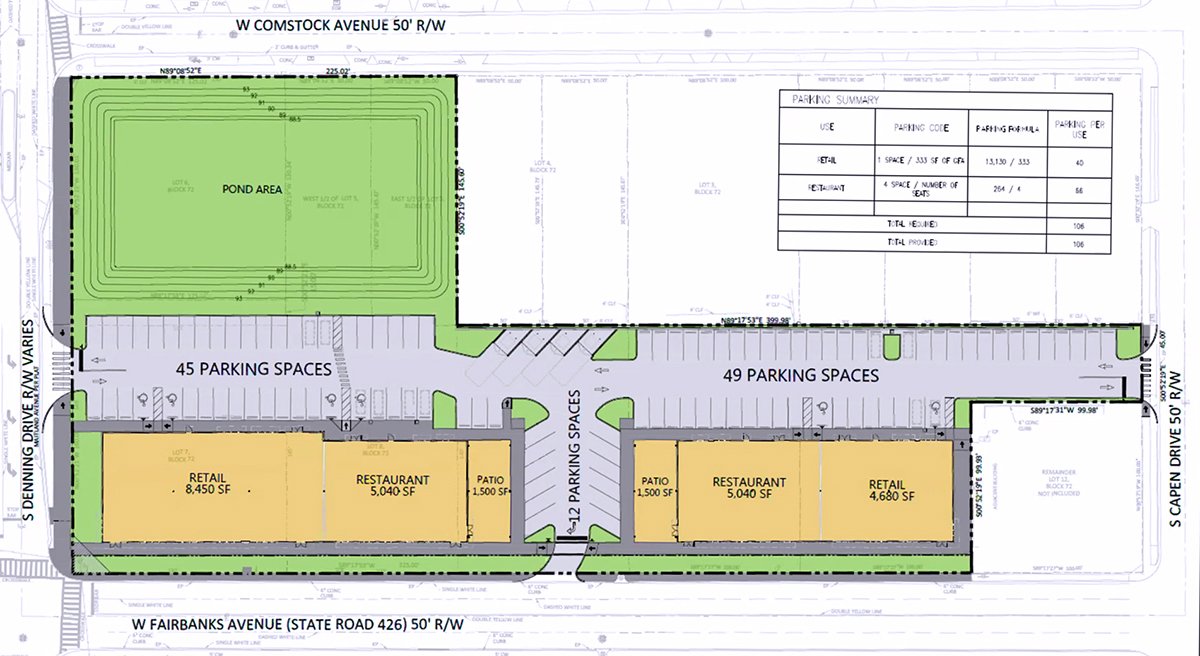 Bob Ziegenfuss, owner of Orlando-based Z Development Services, described the urban design concept as “an adaptive reuse” of the one-story design that currently exist at the property, and is “meant to feel like it’s been there for a while.” Buildings will be set closer to the street with an 18-inch elevation from the sidewalk to separate possible outdoor dining areas. The decreased setback from the street is due in part to the donation of two feet along the Fairbanks Avenue frontage that will allow the city to widen traffic lanes from nine to 10 feet.